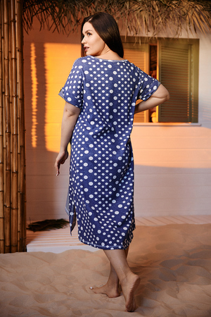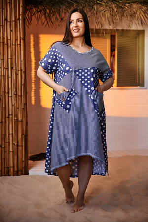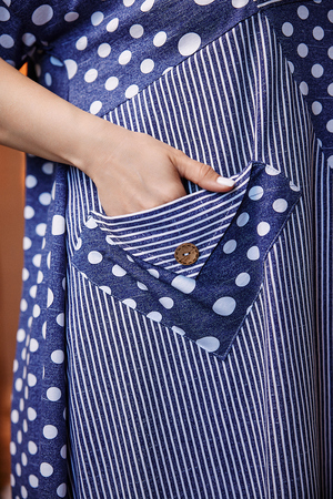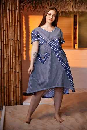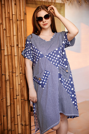Платье женское, свободное, силуэт трапеция. Рукав короткий цельнокроенный с манжетой. Горловина Y-образная. Полочка состоит из четырех асимметричных частей, две части по диагонали из ткани в горошек, две другие - из мелкой полоски. Низ фигурный, спереди короче, чем сзади. По боковым швам разрезы. На полочках два накладных кармана, форма карманов квадраты, расположенные по диагонали, верхние уголки карманов зафиксированы декоративными пуговицами "кокос". Также пуговицы пришиты на отогнутых уголках манжет. Сочетание тканей "горошка" и мелкой полосы придают платью особую неповторимость и привлекательность.