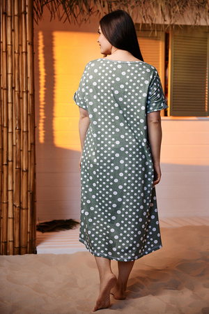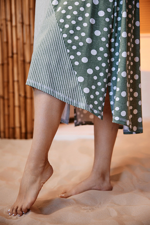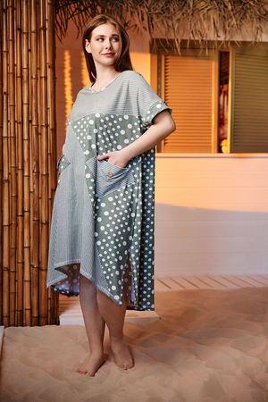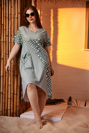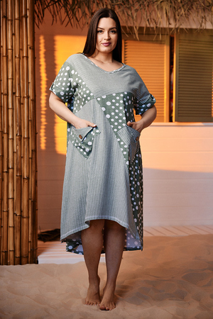 Платье женское, свободное, силуэт трапеция. Рукав короткий цельнокроенный с манжетой. Горловина Y-образная. Полочка состоит из четырех асимметричных частей, две части по диагонали из ткани в горошек, две другие - из мелкой полоски. Низ фигурный, спереди короче, чем сзади. По боковым швам разрезы. На полочках два накладных кармана, форма карманов квадраты, расположенные по диагонали, верхние уголки карманов зафиксированы декоративными пуговицами "кокос". Также пуговицы пришиты на отогнутых уголках манжет. Сочетание тканей "горошка" и мелкой полосы придают платью особую неповторимость и привлекательность.