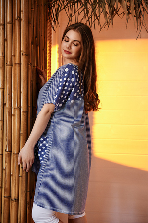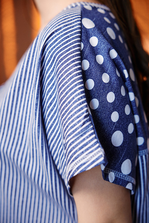 Туника женская, свободная, к низу расширенная. Рукав цельнокроеный короткий. Горловина Y-образная. Туника из двух полочек, одна полочка и кокетка спинки: в горошек, другая полочка, кокетка полочки и спинка: в полоску. На полочке в полоску большой накладной карман из ткани в горошек с декоративной кокосовой пуговицей на вертикальном хлясте. На полочке в горошек нагрудный карман в полоску с хлястом и декоративной кокосовой пуговицей. На спинке сзади складка для обеспечения достаточной свободы по бедрам. Низ туники фигурный, полочка короче спинки.