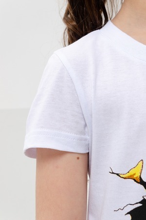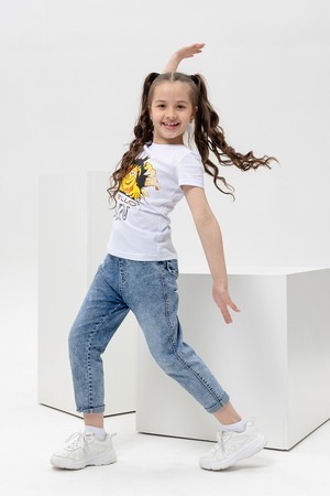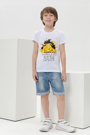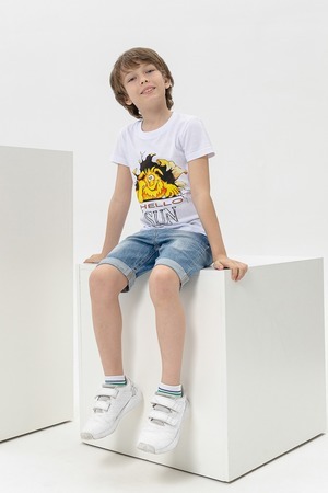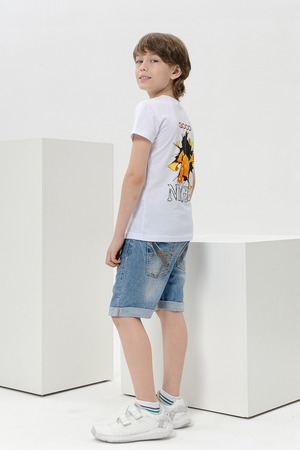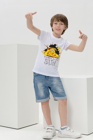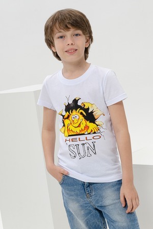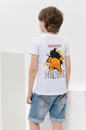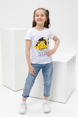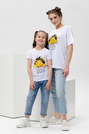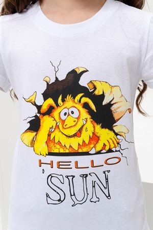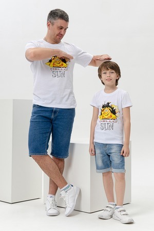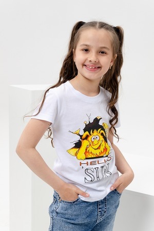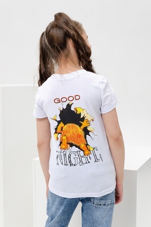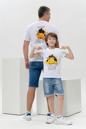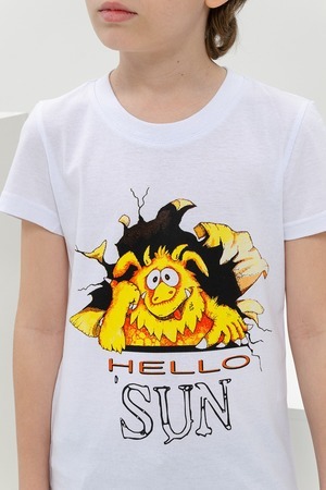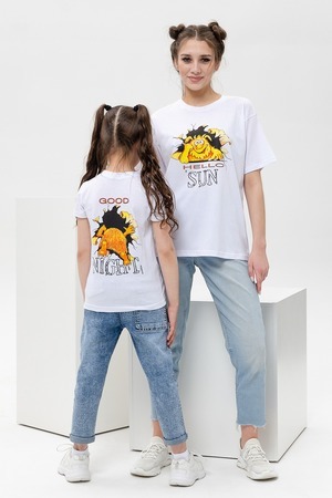 Удобная футболка с забавной печатью. Оригинальное изображение чудоковатого монстра позволит привлечь внимание как спереди, так и со спины. Белый цвет ткани прекрасно отражает солнечные лучи, что позволяет чувствовать себя комфортно в жаркую погоду. С моделями 18033 и 18035 вы сможете создать весёлую семейную коллекцию, а с моделью 18038 разнообразить гардероб своего ребёнка.