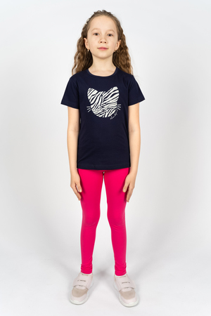 Лаконичный и стильный комплект для девочки, состоящий из футболки и лосин. На футболке изображен выразительный принт из шелкографии в виде мордочки кота. Футболка для девочки прямого силуэта с втачным коротким рукавом. Горловина круглая, обработана воротником из кулирки. Низ изделия и рукавов обработан швом в подгибку. На полочке принт шелкография+флок. Лосины для девочки прилегающего силуэта. Пояс цельнокроенный, с эластичной тесьмой внутри, закрепленной в шов. Низ лосин обработан швом в подгибку.