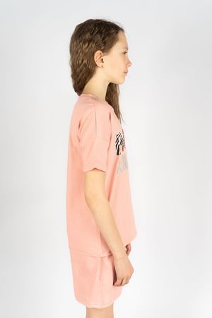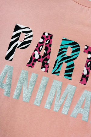 Футболка для девочки прямого силуэта со спущенным рукавом. Модный современный принт выполнен в двух цветах для каждой строчки, подчеркивая разностороннюю индивидуальность ребенка и говорит о любви к животным. Мягкий хлопок, из которого изготовлено изделие, позволяет коже дышать и не стесняет движений. Горловина круглая, обработана воротником из кулирки. Низ изделия и рукава обработан швом вподгибку. На полочки принт, шелкография с глиттером.