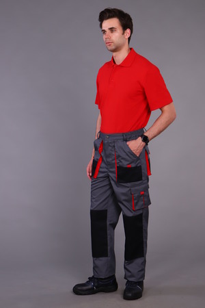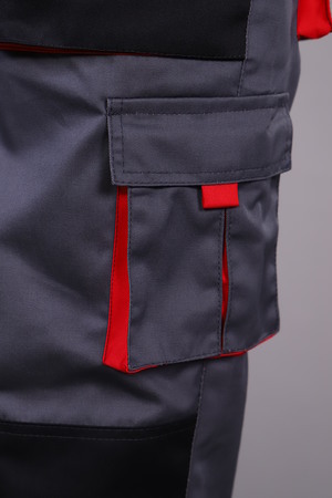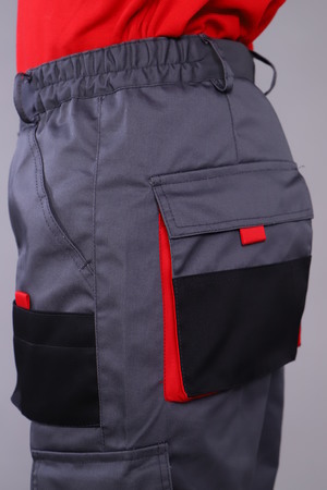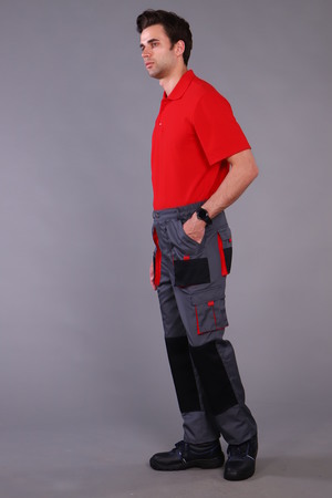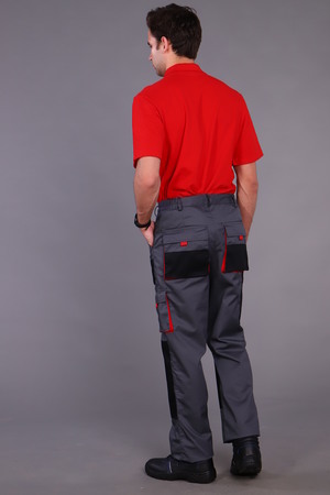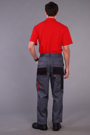 Брюки с застежкой гульфика на тесьму «молния» и притачным поясом. Передние половинки брюк с двумя боковыми накладными объемными карманами с фигурным входом, с наколенниками. Наколенники со входом для амортизационных накладок. На накладных карманах обработаны малые накладные карманы. Задние половинки с накладными объемными карманами с усилением и с клапанами. На правой задней половинке накладной карман под инструменты. Плотность ткани 240г/кв.м