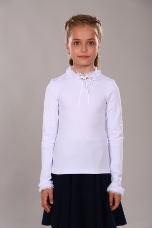 Элегантная и нарядная блузка для вашей маленькой принцессы! Нежная трикотажная блуза для девочки станет замечательным выбором для 1 сентября. Ведь осень уже за углом и модная школьная форма для детей - это то, что совсем скоро понадобится каждому школьнику. Горловина и рукава декорированы изящным кружевом. Стильная кружевная кофта лонгслив от бренда JerseyLab - это хлопок, нежный трикотаж, который прекрасно дышит и не вызовет аллергию, идеальный вариант для школы для детей и подростков. Такая блузка с длинным рукавом отлично подойдет и как повседневная детская кофточка и как нарядная блузка на праздник или на выпускной. Она превосходно будет смотреться и с различными детскими юбками, и со стильными и удобными брюками. Также очень стильный образ можно получить, сочетая ее со школьным или классическим сарафаном, или комбинезоном. Нежное кружево вокруг горловины придает изящность и оригинальность. Комбинируя эту блузу с различными жакетами и кардиганами, ваша маленькая модница сможет носить ее и в прохладное время года, как в демисезон, так и в зимний период. Пусть ваша стильняшка всегда чувствует себя самой красивой, а мы позаботимся о ее комфорте и безопасности, производя самую стильную и качественную одежду для детей!