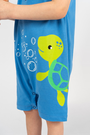 Песочник - это удобная и комфортная одежда для ребенка. Изделие изготовлено из высококачественного 100% хлопка, не натирает кожу и выдержит множество стирок. Принт с черепашкой придется по вкусу любому ребенку и взрослому. Горловина круглая, обработана рибаной. На планке 3 пробивные кнопки. На полочку нанесен принт, уходящий в правый боковой шов. На задних половинках шортиков по нижнему срезу ластовица, добавляющая объем для памперса. По нижнему срезу изделия застежка на пробивные кнопки.