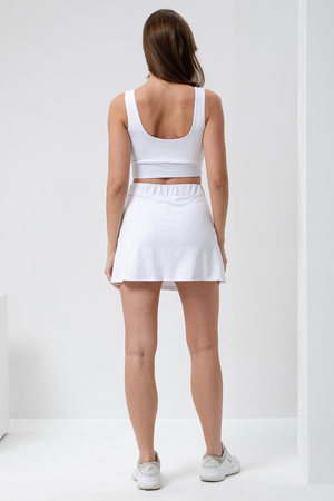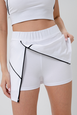 Костюм спортивный состоит из укороченного топа и юбки+шорты. На топе и юбке стильный принт. Предназначен для активного отдыха и занятия спортом.