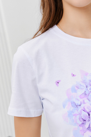 Футболка женская - это классика женского гардероба любой девушки. Это базовая модель с ярким принтом отлично смотрится с джинсами, юбками, брюками. Прямой силуэт, втачной рукав, горловина округлой формы обработана обтачкой из основного полотна.