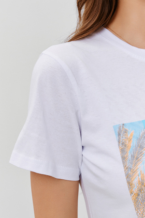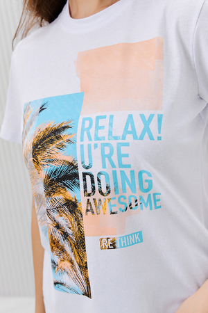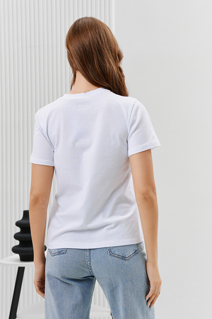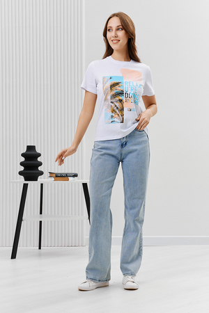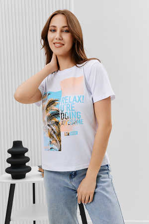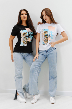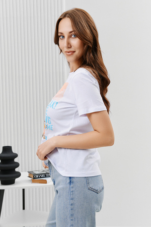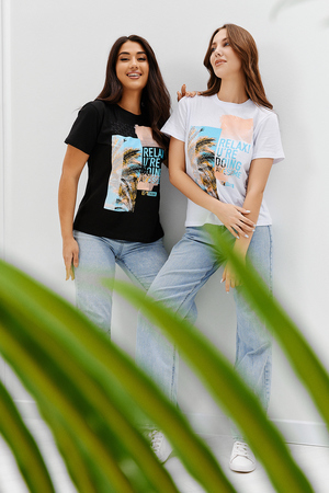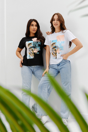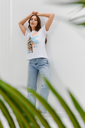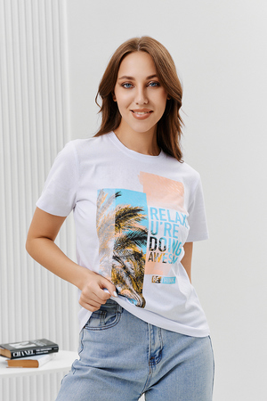Футболка женская - это классика женского гардероба любой девушки. Это базовая модель с ярким принтом отлично смотрится с джинсами, юбками, брюками. Прямой силуэт, втачной рукав, горловина округлой формы обработана обтачкой из основного полотна.