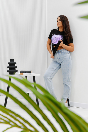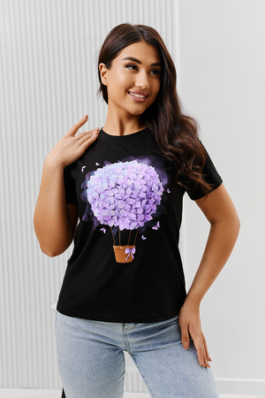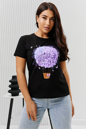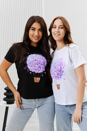 Футболка женская - это классика женского гардероба любой девушки. Это базовая модель с ярким принтом отлично смотрится с джинсами, юбками, брюками. Прямой силуэт, втачной рукав, горловина округлой формы обработана обтачкой из основного полотна.