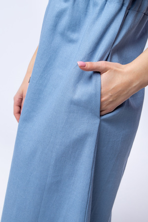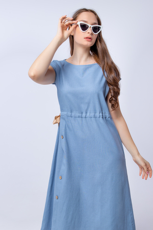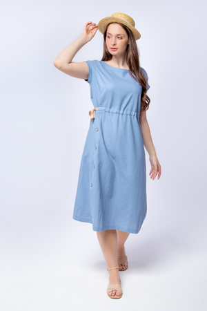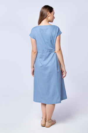 Женское платье с акцентом на талии разработано специально для жарких летних дней. Благодаря свободной посадке платья в нём будет комфортно на улице, а длинна и фасон позволяют ему любимчиком в офисном гардеробе. Пояс с завязкой сбоку, выгодно подчеркнёт талию, а вертикальный ряд пуговиц на юбке вытянет силуэт и сделает его стройнее. Лён, из которого выполнено платье, является экологичным и дышащим материалом. Пуговицы из дерева отлично дополняют дизайн платья.