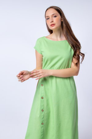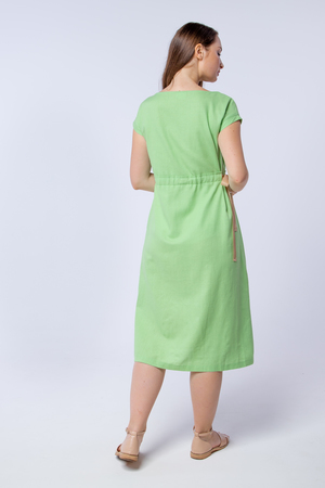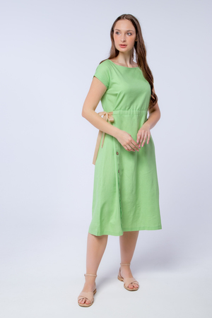 Женское платье с акцентом на талии разработано специально для жарких летних дней. Благодаря свободной посадке платья в нём будет комфортно на улице, а длинна и фасон позволяют ему любимчиком в офисном гардеробе. Пояс с завязкой сбоку, выгодно подчеркнёт талию, а вертикальный ряд пуговиц на юбке вытянет силуэт и сделает его стройнее. Лён, из которого выполнено платье, является экологичным и дышащим материалом. Пуговицы из дерева отлично дополняют дизайн платья.