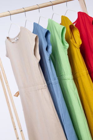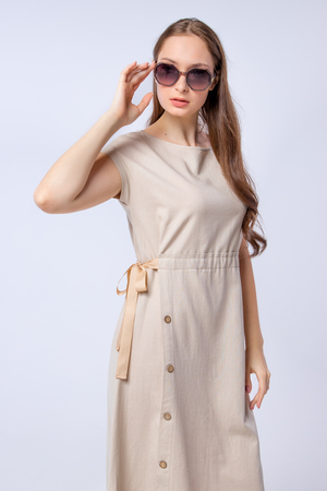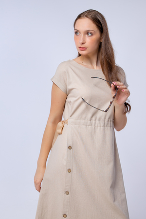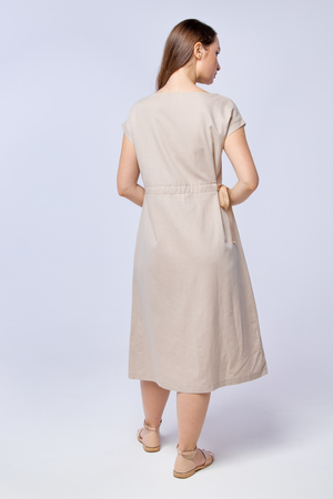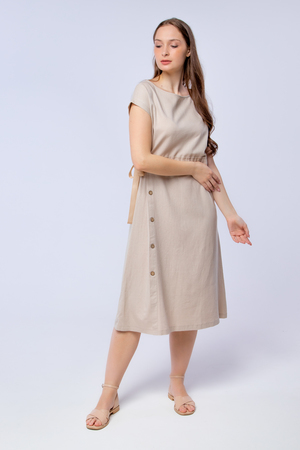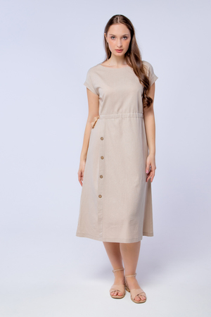 Женское платье с акцентом на талии разработано специально для жарких летних дней. Благодаря свободной посадке платья в нём будет комфортно на улице, а длинна и фасон позволяют ему любимчиком в офисном гардеробе. Пояс с завязкой сбоку, выгодно подчеркнёт талию, а вертикальный ряд пуговиц на юбке вытянет силуэт и сделает его стройнее. Лён, из которого выполнено платье, является экологичным и дышащим материалом. Пуговицы из дерева отлично дополняют дизайн платья.