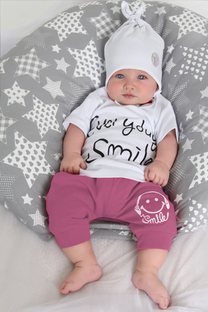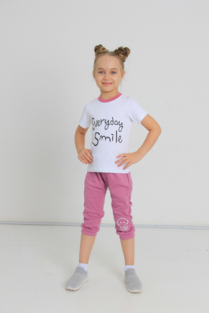 Стильный костюм из нежной очень приятной к телу ткани-интерлок. 100% хлопок высокого качества сохраняет форму и легко стирается. Хлопок обеспечивает отличную терморегуляцию и воздухообмен. В такой одежде ваш ребенок всегда будет чувствовать себя комфортно и уютно. Футболка с принтом сзади и спереди. Удобные не стесняющие штанишки на широком поясе с манжетами по низу и маленьким принтом . Костюм отлично подойдет для повседневных прогулок или в качестве домашнего костюма.