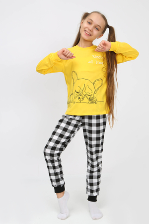 Пижама детская, состоящая из джемпера и брюк. Джемпер прямого силуэта, с втачным длинным рукавом. Горловина круглая обработана воротником из рибаны. По низу рукавов манжеты из рибаны. Низ изделия обработан швом в подгибку. На полочке принт с флуоресцентной краской. Брюки прямого покроя, из набивного полотна. Пояс цельнокроенный, с эластичной тесьмой внутри. По низу изделия манжеты из рибаны.