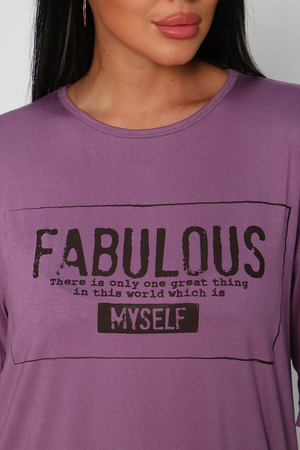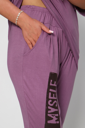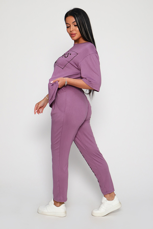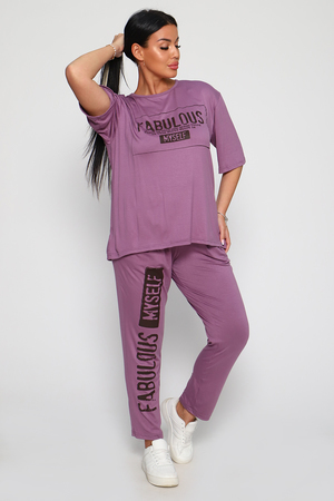 Костюм из вискозы, состоит из футболки и брюк. Футболка свободная, рукав до локтя, горловина обработана под окантовку по переду принт. Брюки по переду со складками, с карманами с принтом на одной брючине, длина до щиколотки. На модели 48-50 размер.