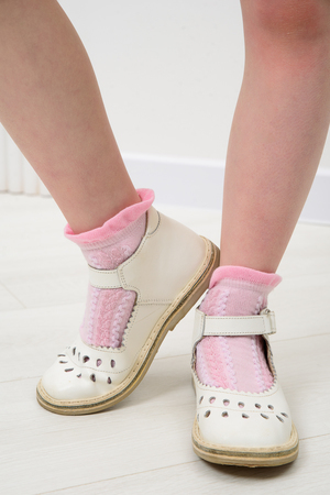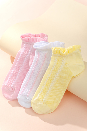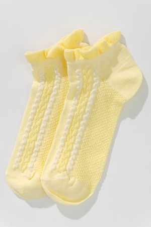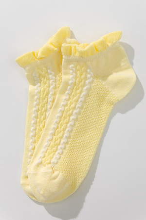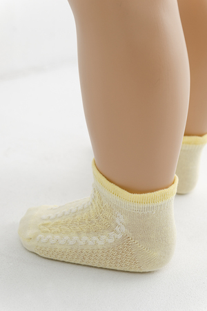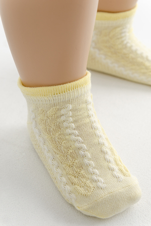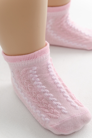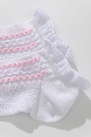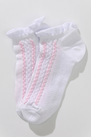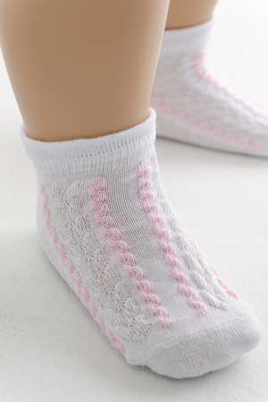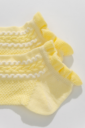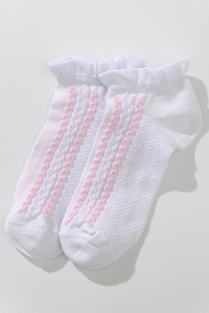 Летние носочки для девочки. Верх носочка выполнен рюшей, стопа узором. На передней части носка узор и "косички" контрастной пряжей.