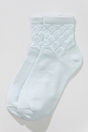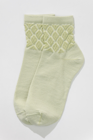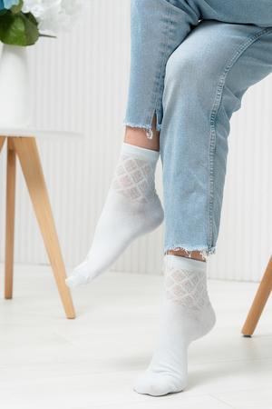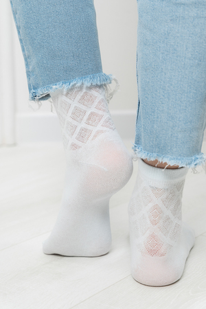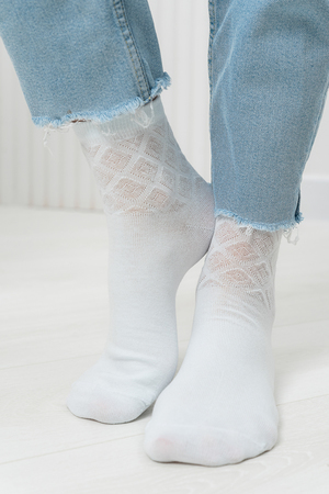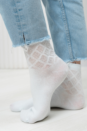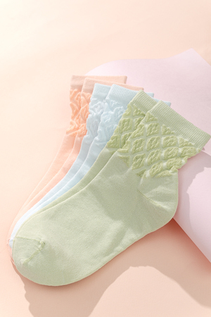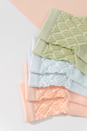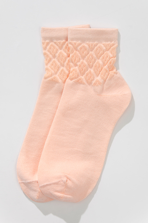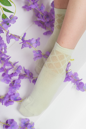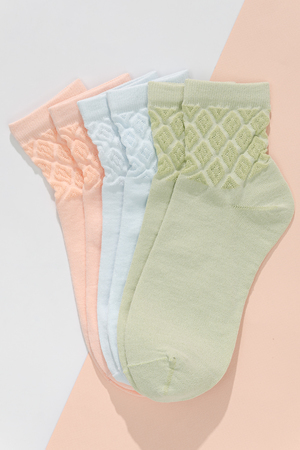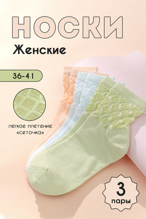 Летние носочки для девушек и женщин. В наборе 3 пары трех цветов: салатовый, персиковый и белый. Верх носка выполнен узорами.