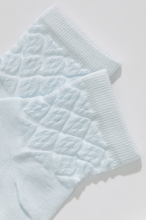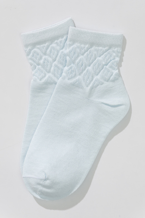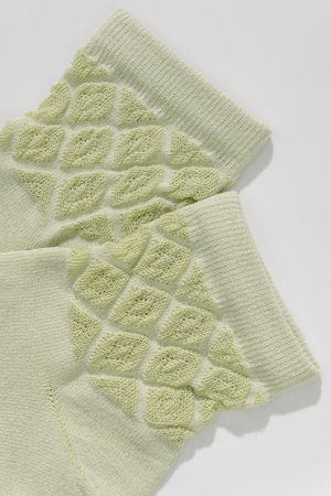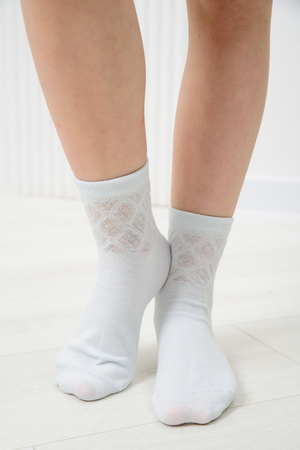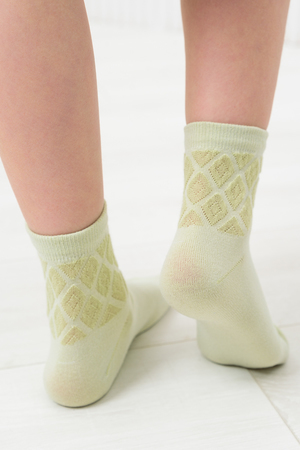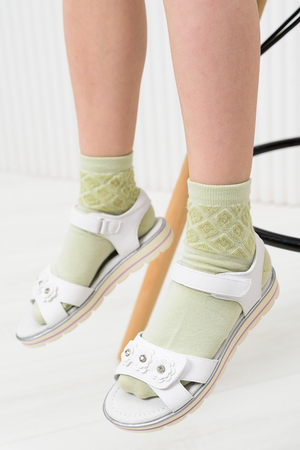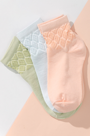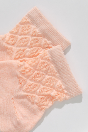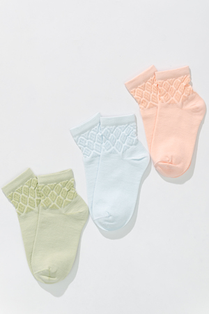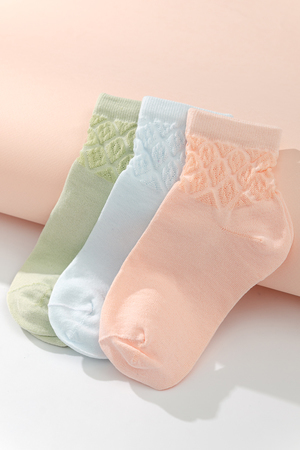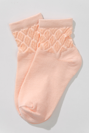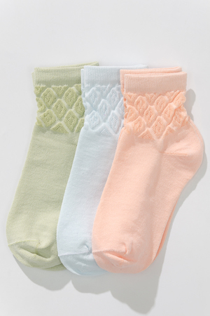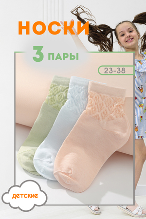 Детский комплект летних носочков. В наборе 3 пары трех цветов: салатовый, персиковый и белый. Верх носка выполнен узорами.