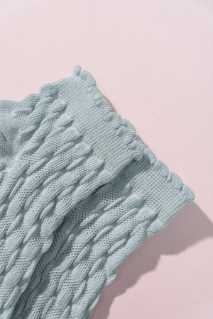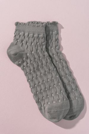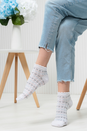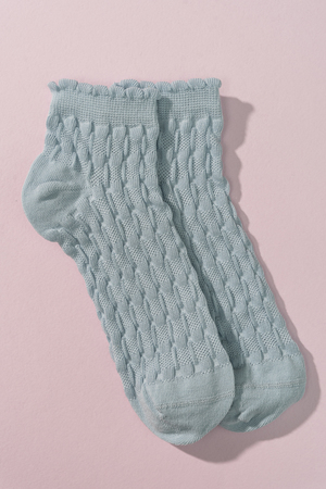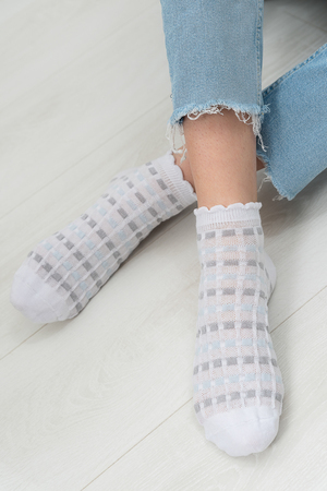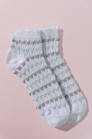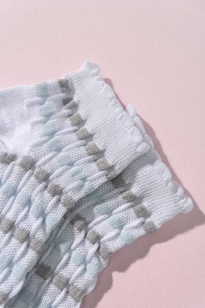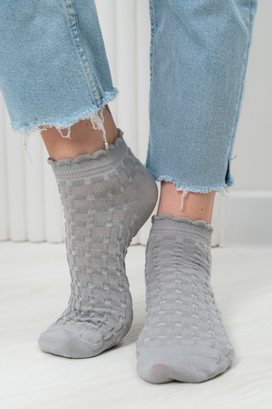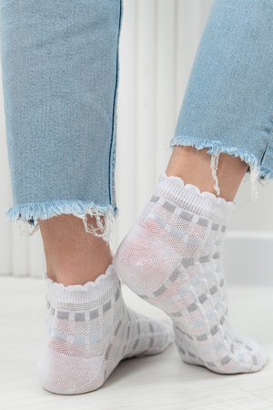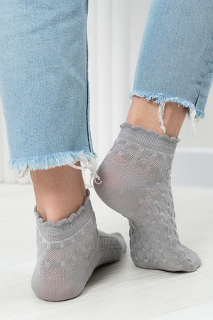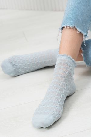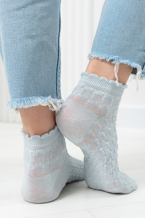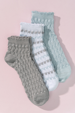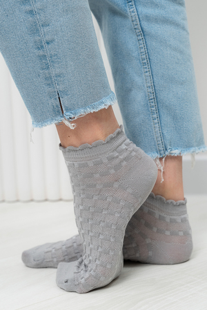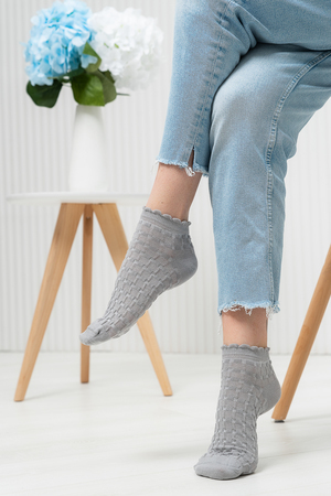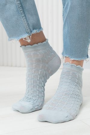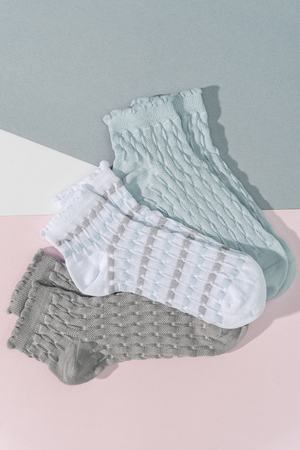 Женские носочки, выполнены ажурным узором. Резинка в виде рюшки. Комплект из трех пар разного цвета (серый, голубой, белый в полосу).