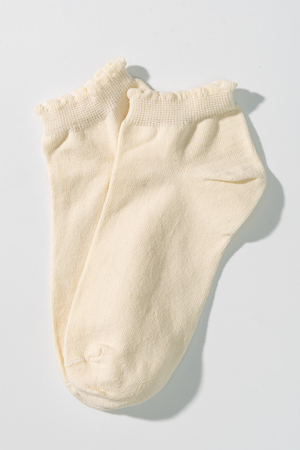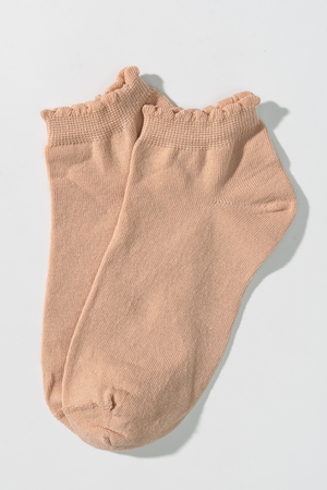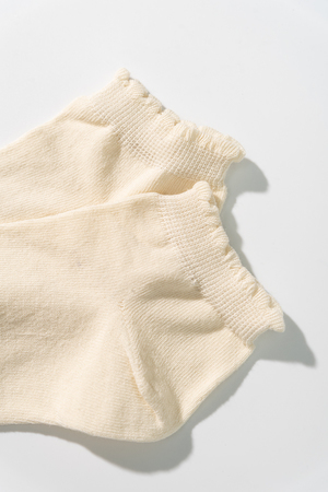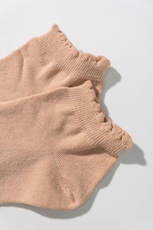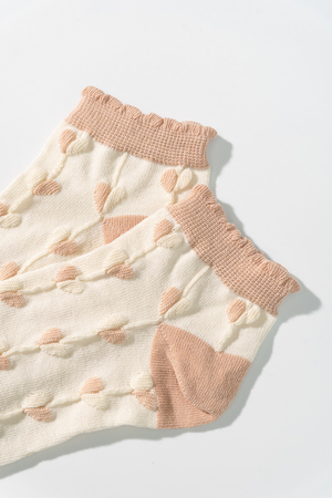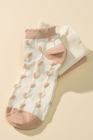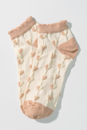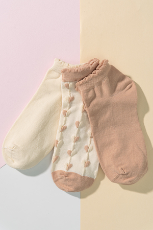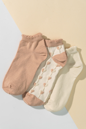 Комплект женских коротких носочков - 3 пары. Один носочек выполнен объёмным узором в виде сердец, два других гладью коричневого и кремового цвета. Верх резинки носка выполнен рюшей.