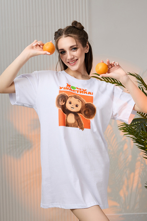 Туника-футболка в стиле "оверсайз". Прямая, свободная, длиной выше колена, с округлой горловиной. Рукав короткий. Горловина обработана обтачкой из основного полотна.