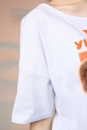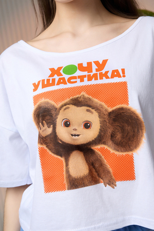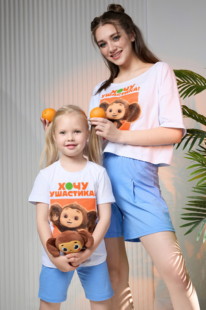 Костюм состоит из укороченной футболки "оверсайз" и шорт. Футболка с округлой горловиной. Рукав короткий. Горловина обработана бейкой из основного полотна. Шорты на резинке, со складками в верхней части передних половинок.