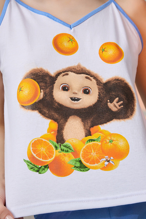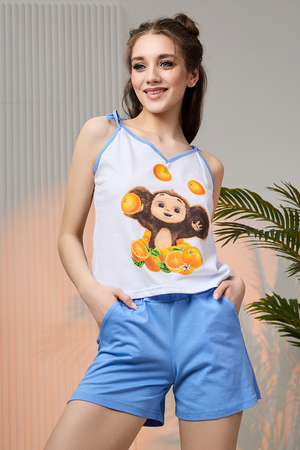 Комплект состоит из майки и шорт. Майка на тонких бретелях, с V-образной горловиной на полочке. Горловина и бретели обработаны бейкой из отделочного полотна. Шорты прямые, с карманами, на поясе.