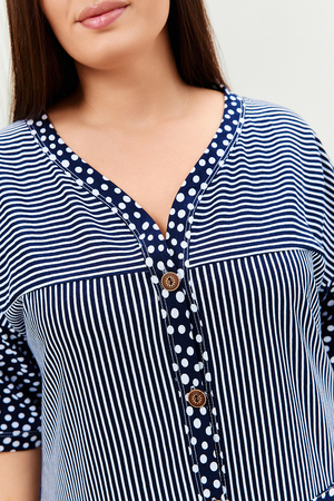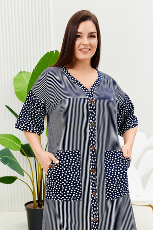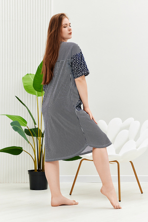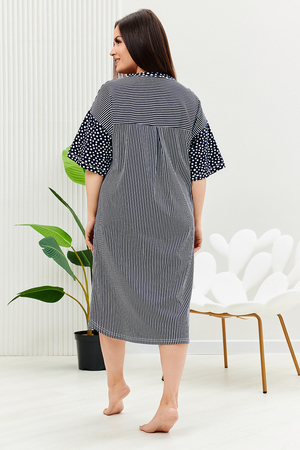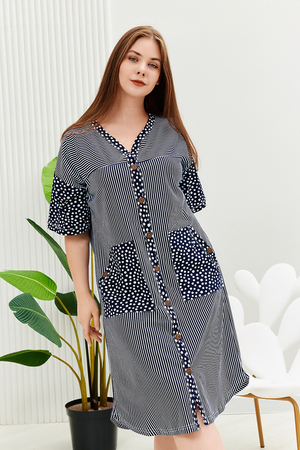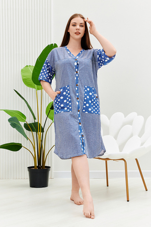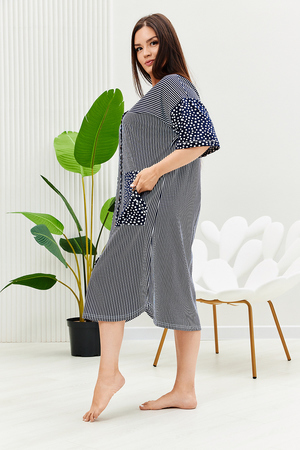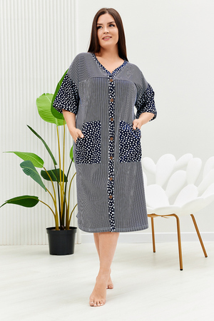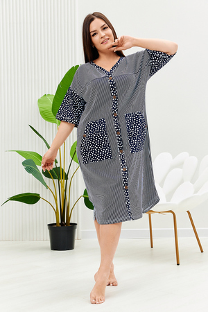 Халат женский прямого силуэта, расширение к низу за счет складки на спинке. Рукав короткий цельнокроенныйсо швом. На полочке и спинке кокетки и накладные карманы. Борт изделия, низ рукавов и вход в карман окантованы широкой бейкой из отделочной ткани. Сочетание отделки из гороха и основной ткани из полоски придают изделию особую актуальность.