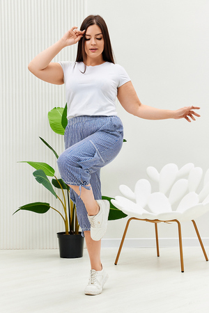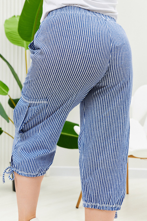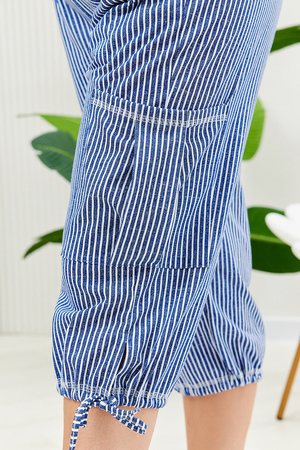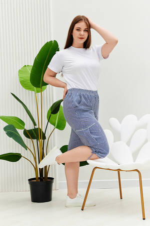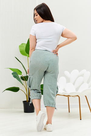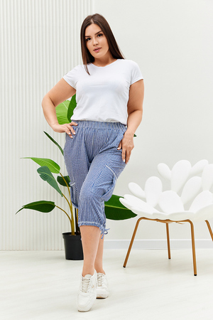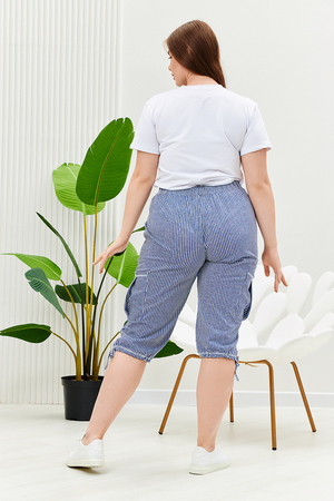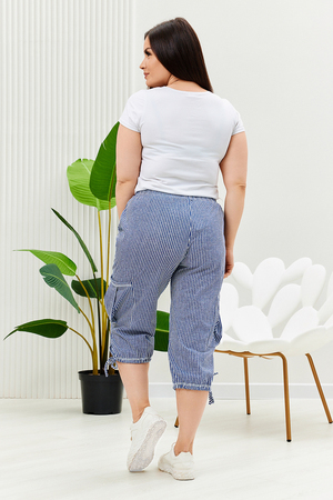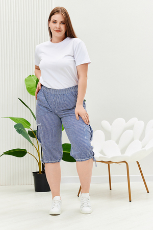 Бриджи прямого силуэта, внизу брюк разрезы и утяжки. На передних частях внутренние карманы и боковые с бантовой складкой. Пояс выполнен на многоигольной машине