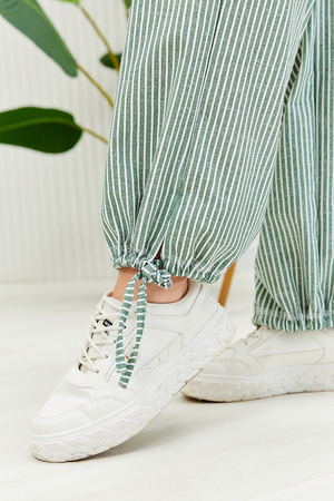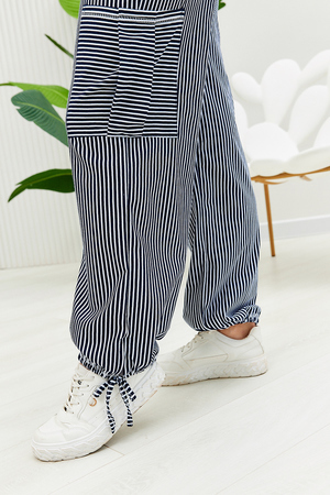 Брюки прямого силуэта, внизу брюк разрезы и утяжки. На передних частях внутренние карманы и боковые с бантовой складкой. Пояс выполнен на многоигольной машине