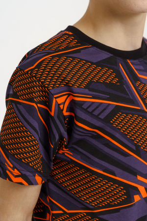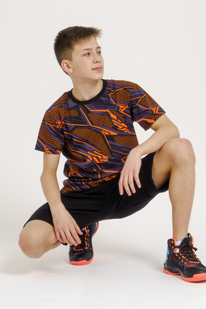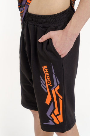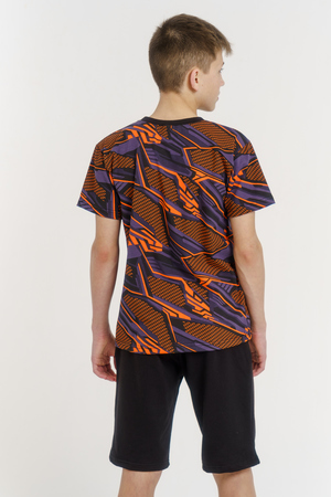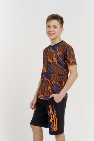 Костюм для подростков состоит из двух изделий - футболки и шорт. Футболка выполнена из ткани с абстрактным принтом. Футболка прямого свободного кроя, круглый вырез горловины, втачной рукав. Шорты выполнены из футера 2-х нитки, прямого кроя, с удобной посадкой. На передней половинке шорт - печать.