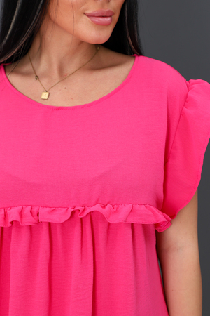 Платье женское прямого силуэта, короткий втачной рукав в виде оборки, округлый ворот, на передней полочке оборка на груди, на задней полочке сверху завязки. Легкое и удобное.