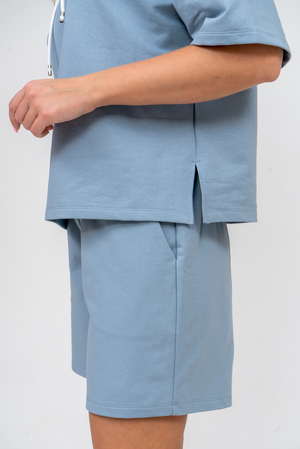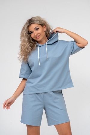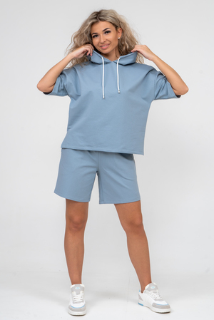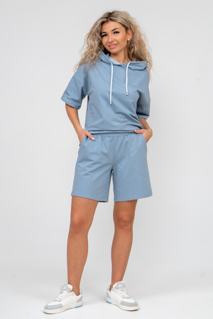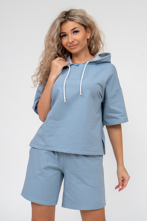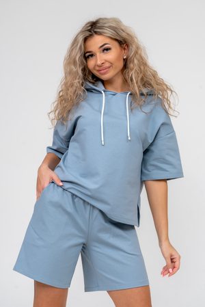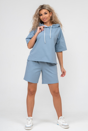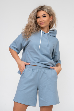 Женский костюм 2-ка выполнен из футера  высокого качества с хлопком и небольшим добавлением полиэстера и лайкры, что позволяет изделию не скатываться и оставлять идеальный внешний вид на долгое время. Костюм состоит из толстовки и шорт. Толстовка с капюшоном и шнурком. Линия плеча спущена, рукав укороченный, по бокам имеются небольшие разрезы. Свободный крой прекрасно будет смотреться на дамах с любыми формами. Костюм такого плана представлен в широкой размерной сетке, что позволяет выбрать его как девушке, так и женщине. Однотонный костюм модных расцветок будет удачным выбором для поездок в отпуск, на пикник, для активного отдыха и прогулок по городу. Будет гармонично сочетаться как с кроссовками, так и с туфлями, балетками или босоножками. Используя эту модель в качестве домашнего костюма, Вы поймёте, что это именно тот самый идеальный вариант, в котором вы будете себя чувствовать удобно, комфортно и современно. Костюм с шортами - это настоящая находка для тех, кто ценит свою индивидуальность!