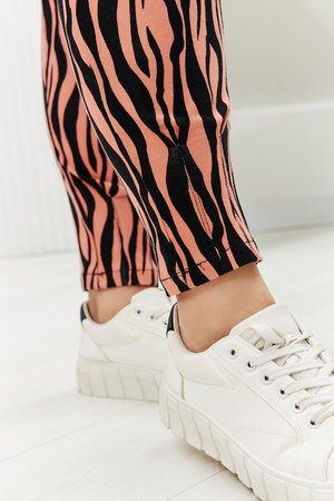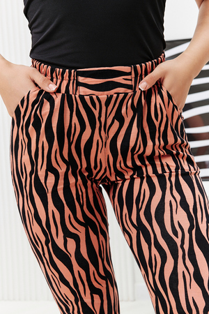 Брюки женские с завышенной талией яркой оригинальной расцветки выполнены из кулирки 100% хлопок. Брюки на широком поясе с резинкой, спереди защипы, по бокам карманы, внизу заужены благодаря защипам. Изделие имеет очень удобную посадку, брюки комфортные в носке, идеально подойдут как для дома, так и для отдыха.