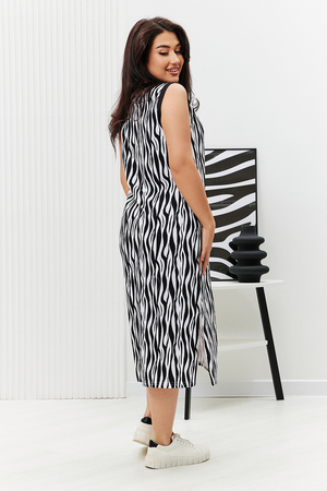 Удлиненное платье-сарафан приталенного силуэта без рукава выполнено из кулирки 100% хлопок оригинальной яркой расцветки. По бокам - разрезы, горловина и проймы обработаны широким кантом. Платье комфортное, идеально подойдет как для дома, так и для отдыха.