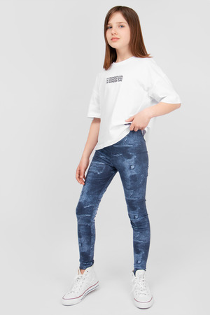 Легкие, комфортные, лосины для девочки, с интересным принтом - имитация джинсовой ткани, по талии на широкой эластичной резинке. Выполнены из натуральной хлопковой ткани. Прекрасный выбор для летних прогулок.
