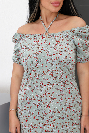 Платье женское полуприталенного силуэта, короткий рукав, округлая горловина с декоративными завязками, на передней полочке разрез снизу. Вид застежки скрытая молния сбоку. Легкое и удобное.