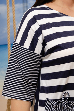 Туника женская прямого силуэта. Рукав цельнокроенный со швом. Горловина округлая. На правой полочке накладной карман, вход которого регулируется завязками. Неповторимость тунике придает сочетание тканей полочек и рукавов из полосы разной ширины. Низ туники фиксируется завязками.