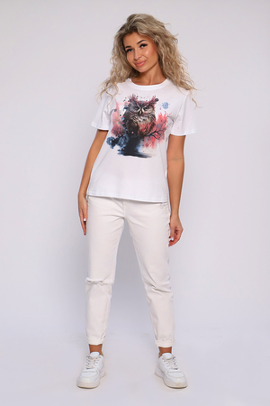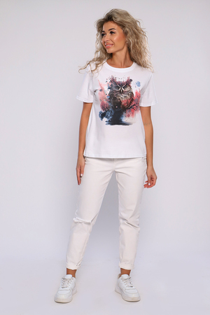 Футболка классического фасона, прямого кроя, с коротким рукавом и округлым вырезом. Декорирована принтом. Универсальная модель футболки отлично подойдет для любого образа и станет необходимой вещью в вашем гардеробе. Ткань кулирка пенье, плотность 160 г.