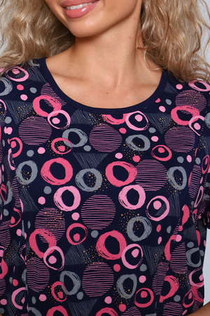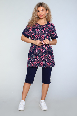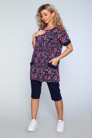 Костюм состоит из туники и бридж. Бриджи с карманами, длиной ниже колена. Туника с короткими рукавами на манжетах. Полочка с отрезными бочками и накладными карманами. Неотъемлемый элемент домашнего гардероба.