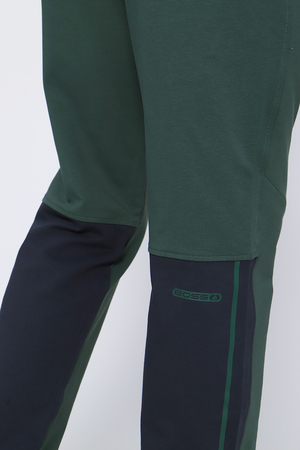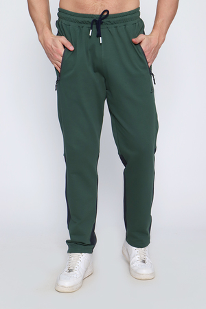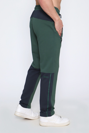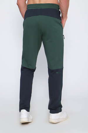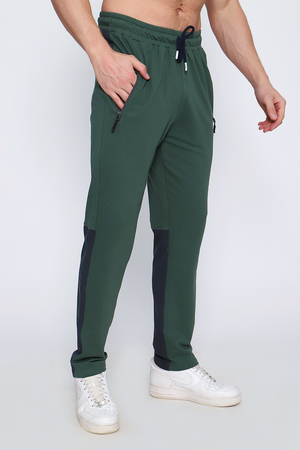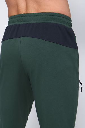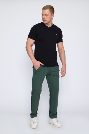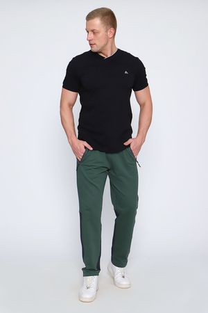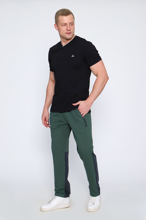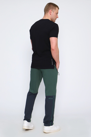 Мужские спортивные брюки изготовлены из качественного футера с лайкрой. Пояс на резинке, дополнен шнуром для дополнительной фиксации на талии, низ брюк на манжете. Особенностью кроя является наличие кокетки сзади и вытачка на уровне колена, которая препятствует вытягиванию ткани. По бокам два прорезных кармана на молнии. Изделие декорировано тканевыми вставками контрастного цвета.