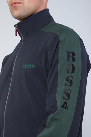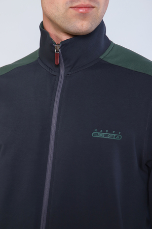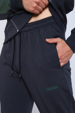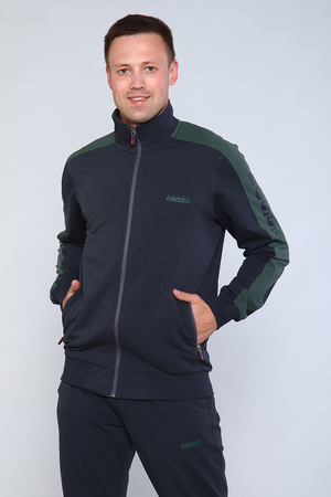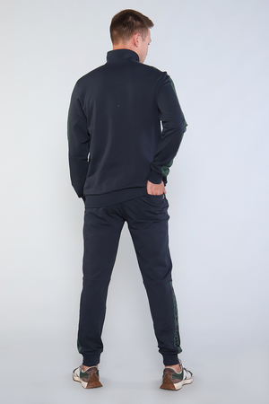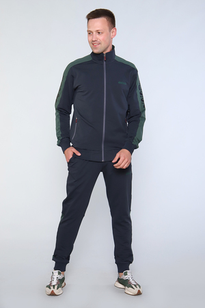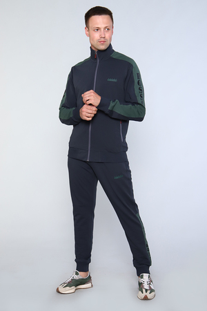 Костюм мужской состоит из толстовки и брюк, изготовленных из качественного футера с лайкрой. Толстовка на молнии с воротником- стойкой и печатью на груди, имеет два боковых прорезных кармана на молнии. Рукава имеют вставки с нанесением печати. Рукава, пояс толстовки и низ брюк на манжетах. Пояс брюк на резинке дополнен шнурком для дополнительного регулирования объёма талии. Сзади справа расположен вместительный накладной карман и прорезные карманы по бокам. У кармана расположена печать идентичная печати на груди.
