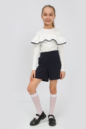 Джемпер хлопковой ткани прилегающего силуэта. Рукав втачной, узкий. Горловина округлой формы, отделана обтачкой из этой же ткани. Украшает джемпер круговая рюша в верхней части изделия, низ которой отделан узкой окантовочной бейкой из ткани контрастного цвета. Ткань гипоаллергенная, хорошо пропускает воздух.