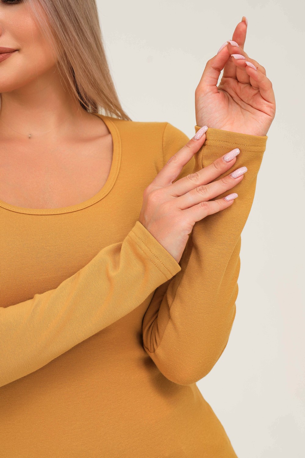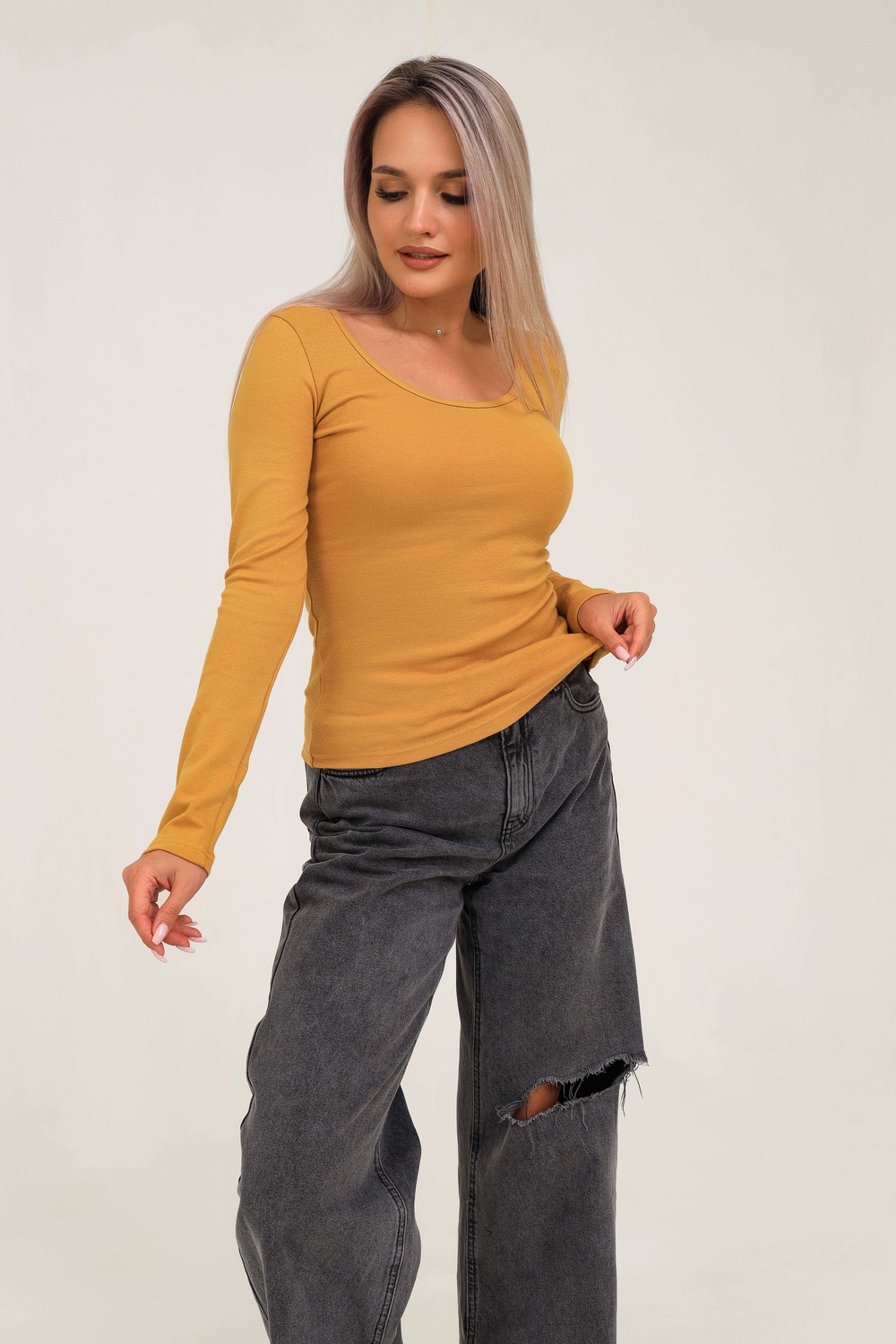 Классический лонгслив с круглым вырезом на груди – универсальная вещь для базового гардероба современной модницы. Модель сшита из мягкого приятного к телу трикотажа пенье качества, облегающая однотонная кофта с длинным рукавом визуально стройнит его обладвтельницу, Глубокое чувственное декольте с открытыми ключицами позволяет создать с этим обтягивающим лонгсливом потрясающий вечерний наряд. В деловом стиле легкая приталенная кофточка тоже будет смотреться уместно, её можно носить под пиджак. Тонкую удлиненную кофту из хлопка удобно использовать в качестве домашней, спортивной одежды. В прохладную погоду прекрасно будет сочетаться с любой верхней одеждой, жилеткой. Плотность ткани 220гр/м2. Размер на модели 46.