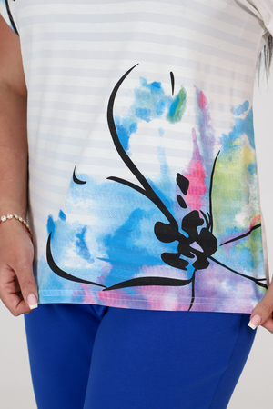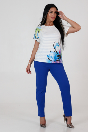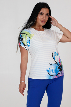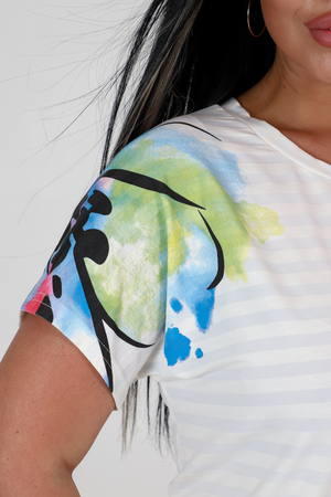 Футболка женская из вискозы. Футболка свободного покроя. Рукав спущенный. Горловина обработана планочкой. На полочке расположен принт.