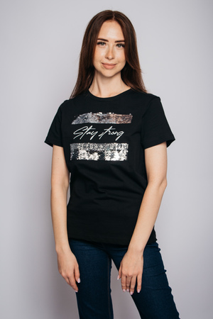 Футболка из хлопка - универсальный элемент базового женского гардероба. Футболка с коротким рукавом, округлым вырезом горловины, из плотной эластичной трикотажной ткани с лайкрой. Изюминка в виде аппликации с пайетками, добавляет однотонной футболке особый шик. Она отлично смотрится как на выпуск, так и в заправленном виде. Футболка женская с вышивкой из пайеток подойдет как для повседневного модного образа, вечерних прогулок, в офис и на работу, активного отдыха во время отпуска или занятий спортом, так для более праздничных и торжественных мероприятий в качестве одного из элементов образа. В сезон осень зима футболка может прекрасно сочетаться с кардиганом, пиджаком, жакетом и другими элементами гардероба в зависимости от ситуации.