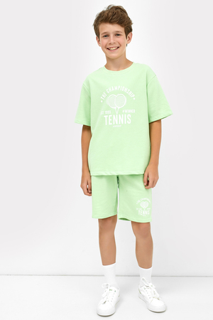 Стильный комплект для мальчиков. Изготовлен из трикотажного футера. Футболка свободного силуэта, длиной до середины бедер, с короткими рукавами и круглой горловиной. Шорты длиной до колена, с эластичной резиной в поясе и регулировочным шнурком. Отличный выбор!