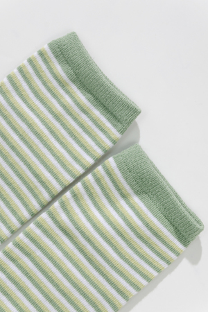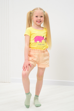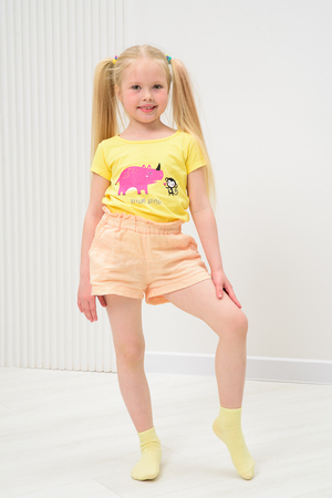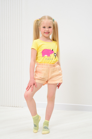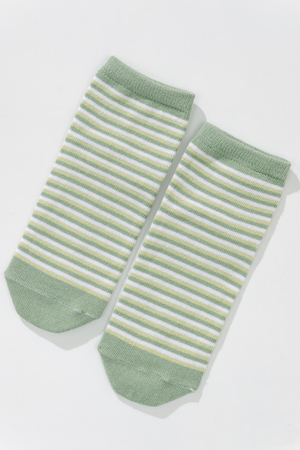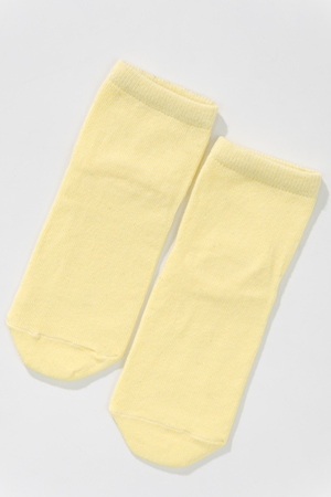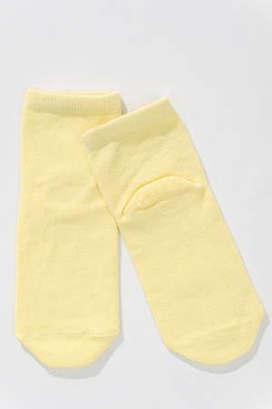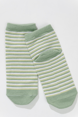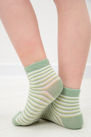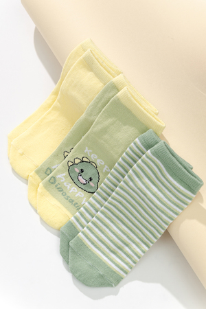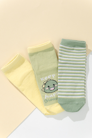 Милые летние носочки для детей. В комплекте три пары разных цветов и узоров. На одной паре носочков изображена мордочка динозаврика, вторая пара полосатая, третья пара однотонного желтого цвета.