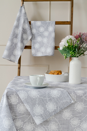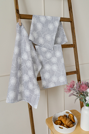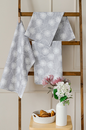 Набор из трех кухонных полотенец размером 60*48 с легким ненавязчивым рисунком придаст любой кухне утонченности. Белые цветочные узоры напоминающие одуванчики отлично гармонируют с серым фоном полотна. Полотенца сшиты из высококачественной хлопковой рогожки, благодаря чему они очень практичны и износоустойчивы. Изделия отлично впитывают влагу, быстро сохнут и не требуют особого ухода. Полотенца легко переносят машинную стирку и совершенно незаменимы в быту. Для удобства использования к каждому полотенцу пришита петелька.