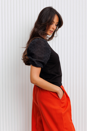 Женская футболка премиум качества из мягкого трикотажа свободного силуэта. Горловина округлая. Изюминкой эту модель делают объемные и рукава из перкали с шитьем, создавая кружевной эффект. Такая модель - отличная база для создания брендовых луков в стиле casual. Приобретите легкость, комфорт и свободу на каждый день, ведь эта вещь полюбится Вами с первого прикосновения. Рекомендуем сочетать с брюками и джинсами пастельной цветовой гаммы. Все товары бренда Raposa производятся в России (Иваново), используются только ткани премиального качества. Ограниченная коллекция только для этой весны!